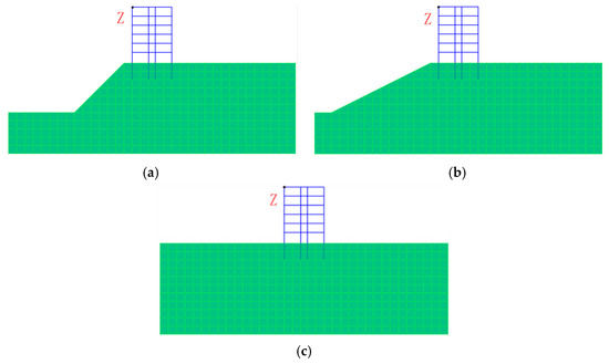 Finite element model. (a) 1:1; (b) 1:2; (c) no slope. The green part represents the soil unit, the blue part represents the upper structure, and the red font represents the observation points.