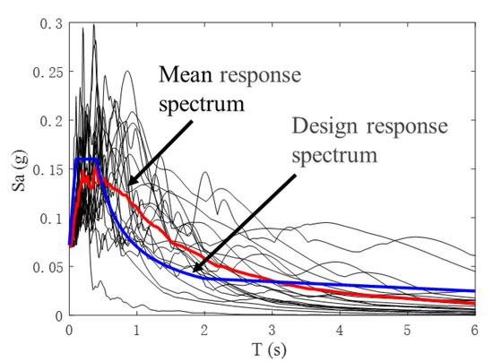 The near-field earthquake will strongly lash the structure due to its characteristics of a long period and velocity pulse [19]. Therefore, the authors selected 20 near-site seismic waves in the PEER database based on the seismic acceleration design response spectrum of the actual slope site. The selection principles [20] were as follows: (1) fault distance <20 km; (2) magnitude >6. Table 4 shows the information of the selected 20 near-field vibration records. The purpose of this study was to perform an analysis of the structural response to frequent earthquakes. So that the peak acceleration of the seismic waves was adjusted to 0.07 g. Figure 6 shows the response spectrum of the input wave. The average response spectrum of the 20 earthquake waves was similar to the design response spectrum of frequent earthquakes.