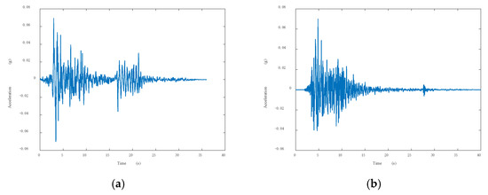 Time history curve of seismic wave acceleration: (a) working condition 6; (b) working condition 18.