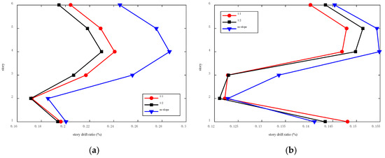 Under condition 6, the story drift ratio of the structure without the slope was the largest, and the story drift ratio of the structure with the 1:2 slope ratio was the smallest. In the fourth layer, the difference in the story drift ratio of the three structures was the most significant. Under condition 18, the slope ratio had different effects on the story drift ratio. The positions of the maximum inter-story displacement angle of the three structures were different. The maximum inter-story displacement angle of the no-slope structure occurred on the fourth floor, while that of the 1:1 slope ratio structure occurred on the first floor, and that of the 1:2 slope ratio structure occurred on the fifth floor. The maximum inter-story displacement angle of the structure decreased with the increase in the slope ratio. This phenomenon shows that there is no qualitative conclusion about the effect of slope ratio on the structure’s story drift ratio.