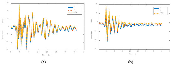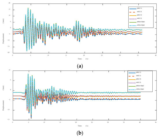 Figure 10 and Figure 11, respectively, show the lateral displacement time history curve of the piles and soil. The monitor points were at buried depths of 3 m and 6 m of the leftmost pile. As seen in the figures, the lateral displacement of the pile was different under the action of the two seismic waves, as was the lateral displacement of the soil. Additionally, the slope rate had the same influence on the lateral displacement of piles and soil.