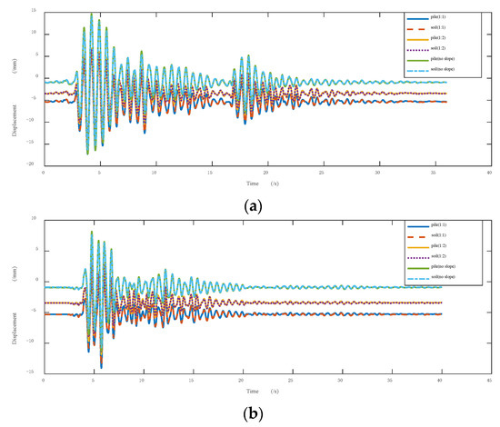 Displacement time history curve of pile and soil (at 3 m buried depth): (a) working condition 6; (b) working condition 18.