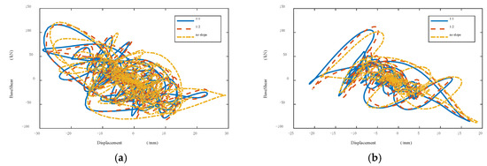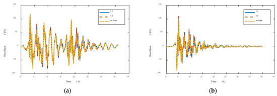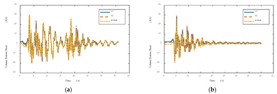 The plots in Figure 12 and Figure 13, respectively, show the base shear and column bottom shear (leftmost column) of the three structures at each time under two different seismic waves. Figure 14 shows the base shear–top floor displacement curve. It can be seen from the figures that, under the action of seismic waves, the existence of the slope had a slight impact on the base shear. Similarly, the slope hardly affected the column bottom shear force, yet the shear at the bottom of the column had a positive X trend at the initial stage. This effect is more obvious with the increase of the slope rate. After the initial phase, the impact of the slope on the shear at the bottom of the column and the shear at the base were very small, which can be almost ignored.