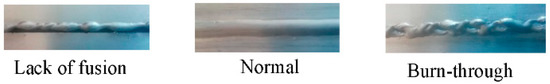 Two experiments were carried out for each butt joint form in Figure 3. The arc sound, welding current, and arc voltage were collected synchronously during the welding experiments. During the welding process, the melt pool became larger due to a larger weld seam or misalignment, making it prone to burn-through or a lack of fusion. A lack of fusion and burn-through are very serious welding defects that can occur during production. Figure 4 shows the three weld states: normal, burn-through, and lack of fusion.
