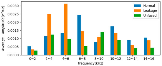 Figure 8 shows the time–frequency spectrum of the three weld seam states. Figure 9 compares the average amplitude of the three arc sounds at different frequency bands. In Figure 8b, along the time axis in the 2~6 kHz bands, multiple peak amplitudes occur. In Figure 9, the frequency amplitude of burn-through state is larger than that of the normal and lack of fusion states in the 2~6 kHz bands. This is because the weld gap becomes larger, resulting in burn-through, a low-frequency sound, and burn-through discontinuity. The frequency amplitude of the lack-of-fusion state is lower than that of the normal and burn-through states in most frequency bands. Since the weld center is offset, the molten pool shape changes, and there is power leakage.