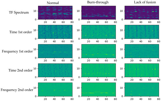 Three samples of different types were randomly selected from the original dataset, and the first-order differential and second-order differential of the three samples were calculated along the time axis and frequency axis, respectively; the results are shown in Figure 10. Subfigures in the same column are the time–frequency spectrum of the arc sound and its first-order differential spectrum and second-order differential spectrum. In Figure 10, the differential spectrum shows the dynamic change in frequencies along the time and frequency axes, and the distribution of the main frequencies in the original time–frequency spectrum can be clearly seen in the differential spectrum. Therefore, the multi-channel time–frequency spectrum, which is superimposed on its differential spectrum, contains a wealth of information. This also explains the higher classification accuracy of the multi-pass time–frequency CNN compared to the single-channel network. However, the accuracy of the 5-CTF CNN decreases, which can be explained by the similarity of the differential spectrums of different weld states, which reduce the classification ability.