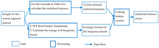 Three traditional classification methods that use manually extracted features as inputs were used for comparison with the method proposed in this paper. These traditional methods are the ID3 decision tree, support vector machine (SVM), and backpropagation neural network (BPNN). First, 22 statistical features were calculated from the original dataset of the arc sound segment, including 14 time domain statistical features, as shown in Table 4, and the average energy of 8 bands, 0~2 kHz, 2~4 kHz, 4~6 kHz, 6~8 kHz, 8~12 kHz, 12~14 kHz, and 14~16 kHz. The construction process of each vector consisting of statistical features is shown in Figure 11. Then, the statistical feature dataset of the arc sound segment was divided into a training set (70%) and a test set (30%), and the constructed SVM, BPNN, and ID3 decision tree models were trained and tested.