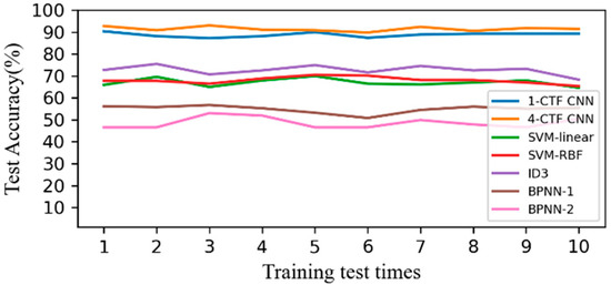 Ten training tests were conducted separately for each classification method. Figure 12 compares the accuracy of each test for different classification methods, where SVM-linear is an SVM model with a linear function kernel, SVM-RBF is an SVM model with a radial basis function kernel, BPNN-1 is a BPNN with one hidden layer, and BPNN-2 is a BPNN with two hidden layers. The classification accuracies of all methods fluctuate slightly. The classification accuracies of BPNN-1 and BPNN-2 are very low, at only about 45~60%. The accuracies of SVM-linear, SVM-RBF and ID3 decision tree are better than the accuracies of BPNN-1 and BPNN-2, at about 65~75%. In comparison, the classification accuracy of the 1-CTF CNN and 4-CTF CNN are dominant, high, and stable, at about 90%. The satisfying results indicate that more information in the time and frequency domain is contained in the time–frequency spectrum than in the manually extracted features, and that the features adaptively extracted by the multi-channel time–frequency CNN are more informative than the features extracted manually.