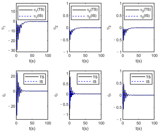 In order to illustrate the advantages of the proposed method, the proposed method is compared with the back-stepping control method [41]. The simulation conditions are set the same as Section 5.2, and the comparison curves of simulation results are shown in Figure 12, Figure 13 and Figure 14.