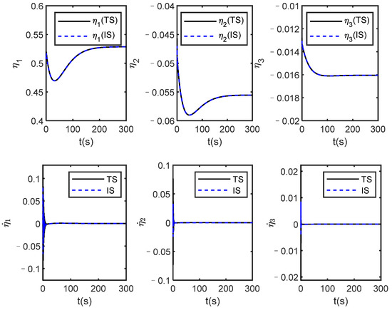 Figure 3, Figure 4, Figure 5 and Figure 6 show the simulation results under one of the constant control signals, and the control law is . In this case, since the control law is arbitrarily given, the rigid body states are divergent, but the states of the identification system are infinitely close to the actual system from the upper part of Figure 2 and Figure 3. In addition, it can be seen from the bottom half of Figure 2, Figure 3 and Figure 4 that all state errors finally converge to 0, which verifies that the proposed identification method is effective, and it is independent of the controller design.