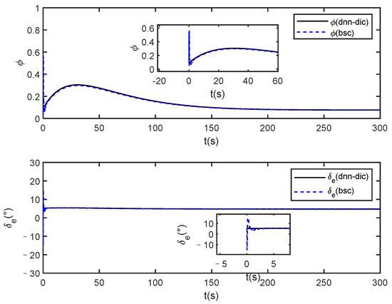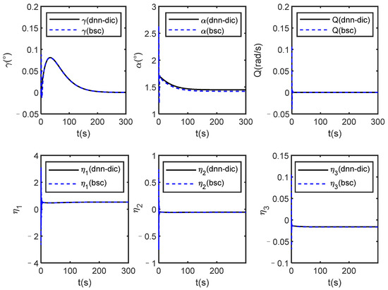 Further observation of the simulation results under constant control law and dynamic inverse control, and it can be seen that under dynamic inverse control, the states of the identification system approach the states of the real system faster, because the weighting coefficient of the DNN is affected by the control law as shown in Equation (16).