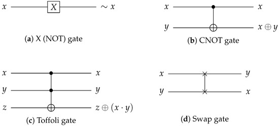 The Toffoli gate shown in Figure 1c stands for a Controlled–Controlled–NOT gate and is also called CCNOT. It can be seen as a CNOT gate with two control qubits, and the target qubit can be inverted only when both control qubits are . The Toffoli gate is not a universal quantum gate, and it can be implemented by a combination of Clifford +T gates. Here, Clifford +T gates are a set of universal quantum gates consisting of Clifford, which includes H gate, S gate, and CNOT gate, and a single T gate, which is non-Clifford. By fixing this set of gates, we can estimate the number of quantum gates, circuit depth, cost, etc. We adopt the method of decomposing Toffoli gates into 8 Clifford + 7T gates from [30]. In this case, the full depth is 8 and the T-depth is 4. The Toffoli gate has the highest quantum cost among the four basic quantum gates of Figure 1.