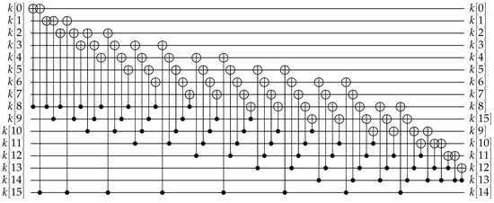 - Jaques, S.; Naehrig, M.; Roetteler, M.; Virdia, F. Implementing Grover Oracles for Quantum Key Search on AES and LowMC. In Lecture Notes in Computer Science, Proceedings of the Advances in Cryptology—EUROCRYPT 2020—39th Annual International Conference on the Theory and Applications of Cryptographic Techniques, Zagreb, Croatia, 10–14 May 2020; Canteaut, A., Ishai, Y., Eds.; Springer: Berlin/Heidelberg, Germany, 2020; Volume 12106, pp. 280–310. [Google Scholar] [CrossRef]