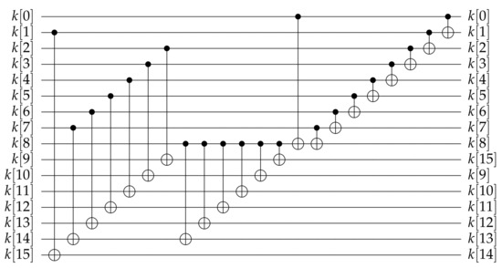 - The attack-target cipher is implemented as a quantum circuit and arranged in oracle . Encrypting the known plaintexts of the superpositioned key produces ciphertexts c for all key values. Afterwards, if the ciphertext matches the known ciphertext, and , so the sign of the solution key value is reversed.