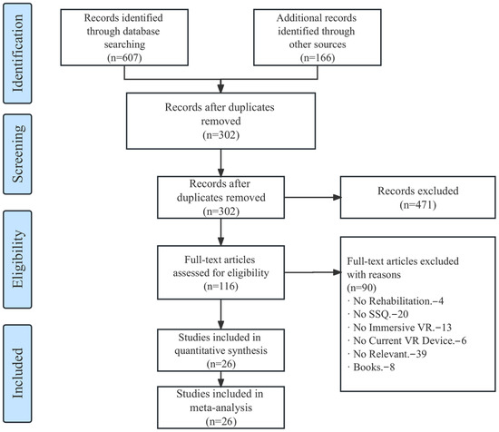 We found 607 publications in the research articles that met the search criteria. Additionally, there were 166 articles added from other sources to enhance diversity. After that, 471 submissions were eliminated due to having mismatched subject names or abstracts. In further detail, there were no investigations into cybersickness and virtual rehabilitation. A total of 302 papers were successfully evaluated for eligibility. In this eligibility assessment, 116 studies (n = 116) fulfilled the criteria for inclusion, and 26 publications ultimately completed the measurement requirements for the meta-analysis. Inevitably, some participants dropped out of the studies in the middle, but the dropout rate in the selected publications was low. The outcomes of the search tactics are shown in Figure 2. Table 2 lists the 26 articles that used the cybersickness measures in virtual rehabilitation interventions. Of the 26 articles reporting airsickness, more than 5 publications included more than 3 experimental groups. The SSQ scores for the before, after, and modified periods were computed in several papers. Three of the papers compared different patients, including young, elderly, and older with Parkinson’s disease, in terms of health. Additionally, one of the publications gathered information from more than 100 participants.