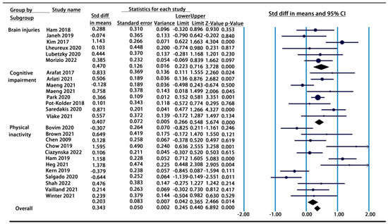 There were variations in the symptoms and conditions among the patients who participated in virtual rehabilitation. The Q-value statistical results in Table 4 show that nausea (Q-value = 8.472, p = 0.037, p ≤ 0.05 *), oculomotor (Q-value = 8.552, p = 0.014, p ≤ 0.05 *), and disorientation (Q-value = 10.724, p = 0.005, p ≤ 0.01 **) symptoms and features of the overall SSQ score (Q-value = 6.628, p = 0.036, p ≤ 0.05 *) were all statistically significant. In Table 5, we gathered VR rehabilitation cases for our meta-analysis that mostly addressed brain injuries (n = 7, 26.9%), cognitive impairment (n = 7, 26.9%), and physical inactivity (n = 12, 46.2%). According to the calculated pooled mean, cognitive impairment (mean = 19.242, 95% CI: 11.294–27.189) and physical inactivity (mean = 18.156, 95% CI: 12.778–23.534) had lower scores than brain injuries (mean = 21.058, 95% CI: 15.357–26.760). In order to compare different symptoms, the mean scores, standard deviations, and sample sizes of the previous and post-available data were collected. As shown in the forest plot of the subgroup SSQ total scores in Figure 3, in contrast to cognitive impairment (mean = 0.407, 95% CI: 0.266–0.548) and physical inactivity (mean = 0.203, 95% CI: 0.042–0.365), subjects with brain injuries (mean = 0.470, 95% CI: 0.223–0.716) had a higher strictly standardized mean of virtual reality sickness.