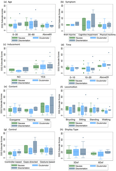 Boxplots for SSQ subscale scores: (a) Age, (b) Symptom, (c) Inducement, (d) Time, (e) Content, (f) Locomotion, (g) Control, (h) Display Type.