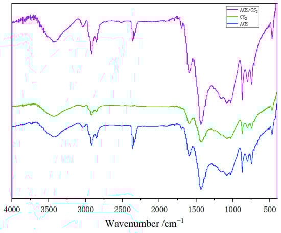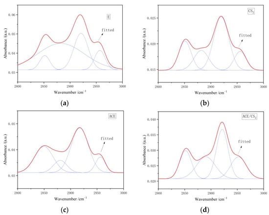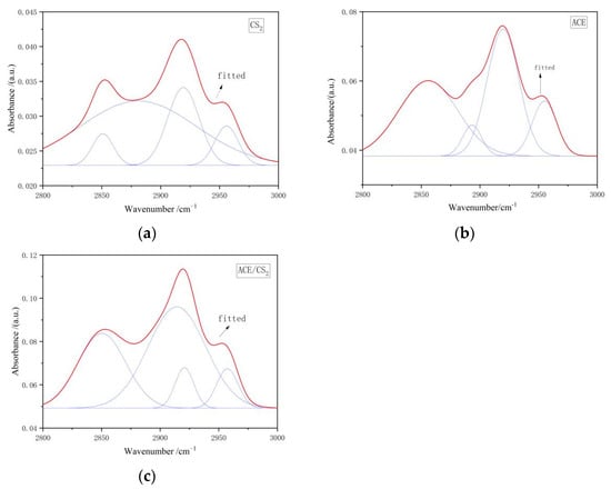 Figure 9 shows the IR peak splitting curves for coal tar residue and its three extractives in the 2800–3000 cm−1 region, and the corresponding fitted data results are shown in Table 9. The acetone residue was dominated by symmetric and asymmetric -CH2 stretching vibrations, while the CS2 and acetone/CS2 mixed solvent residues were dominated by asymmetric -CH2 stretching vibrations.