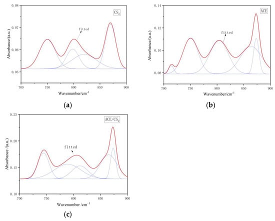 Infrared spectra of extracts in the 700–900 cm−1 range. ((a) is the carbon disulphide fit, (b) is the acetone fit and (c) is the mixed solvent fit. The red line is the fitted curve and the blue line is the sub peak).
