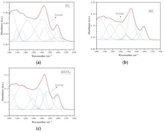 Figure 3 shows the IR peak fitting curves of the three solvent extracts in the 1000–1800 cm−1 interval. Combining the fitted parameters of the spectra shows that the acetone extracts are dominated by asymmetric vibrational absorption peaks in the C-H plane and absorption peaks associated with the C-O-C band, which is probably the ether group of dibenzofuran. The CS2 extracts are dominated by asymmetric vibrational absorption peaks in the C-H plane and asymmetric =C-O-C absorption peaks in aromatic ethers. The mixed extracts are dominated by the C-O stretching vibrations of the phenols. From the results of the fitted data in Table 3, it is clear that the acetone/CS2 solvent mixture extracts more phenolics.