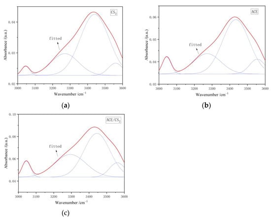 Infrared spectra of 3000–3600 cm−1 extracts. ((a) is the carbon disulphide fit, (b) is the acetone fit and (c) is the mixed solvent fit. The red line is the fitted curve and the blue line is the sub peak).