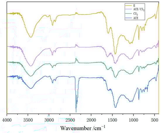 The IR spectra of the coal tar residue and its three solvent extracts are given in Figure 6. It can be seen that the position of the characteristic peaks did not change before and after extraction, but only the peak intensity changed, which indicates that the ultrasonic-assisted extraction method does not destroy the main structure of the tar residue itself. The peak intensity of the hydroxyl functional group at 3440 cm−1 was somewhat reduced compared to the original sample, indicating that some of the hydroxyl-containing compounds were extracted by the solvent. The 910–650 cm−1 of the absorption peaks were classified as characteristic absorption peaks of aromatic compounds. The intensity of the absorption peak at 745 cm−1 is somewhat reduced compared to the original sample, indicating a reduction of aromatic compounds in the extractives.