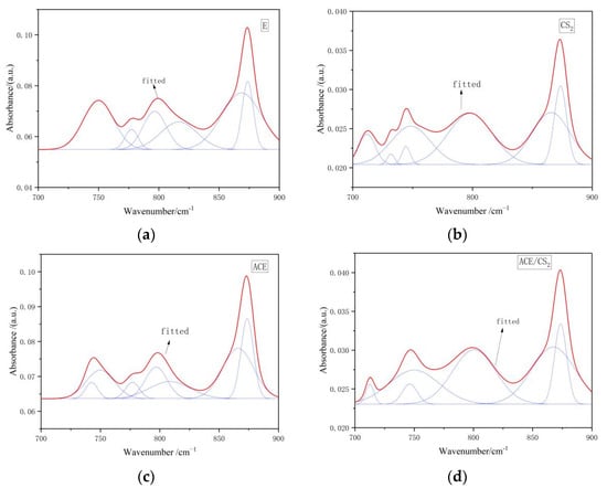 Infrared spectra of the original and extractive residues in the 700–900 cm−1 region. ((a) is an original tar residue fit, (b) is a fit to carbon disulphide, (c) is a fit to acetone and (d) is a fit to a mixed solvent. The red line is the fit line and the blue line is the sub peak).