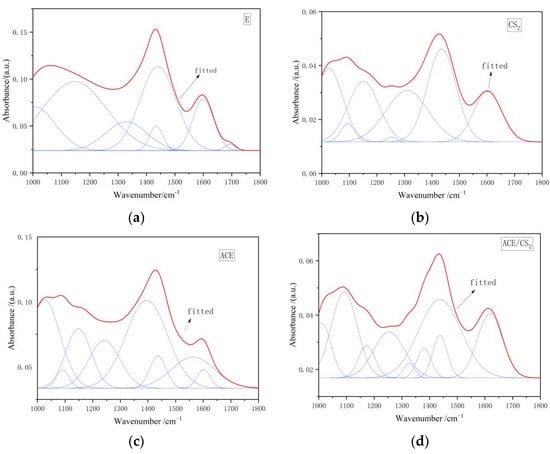 Figure 8 shows the IR peak splitting curves of coal tar residue and its three extractives in the 1000–1800 cm−1 region, and the corresponding fitted data results are shown in Table 8. The asymmetric vibrational absorption peaks in the C-H plane of the group were dominant in the CS2 residue, and the C-N absorption peak was dominant in the CS2 residue. 1158 cm−1 was the C-O stretching vibration of the phenolic hydroxyl group, and the percentage of the phenolic hydroxyl group was higher in all three residues than in the tar residue. The percentage of this group in the CS2 extracts was the most variable, at 18.90%.