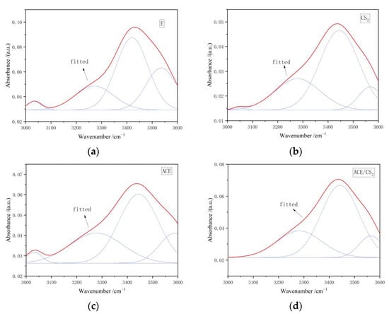 Figure 10 shows the IR peak fitting curves of the coal tar residue and its three extractives in the 3000–3600 cm−1 region. The hydroxyl group is the main functional group that forms hydrogen bonds, and hydrogen bonds are a major non-covalent bond in the structure of coal macromolecules. As can be seen in Table 10, the three solvent extracts were dominated by hydroxyl self-conjugated hydrogen bonds and ring-conjugated hydrogen bonds near 3200 cm−1.