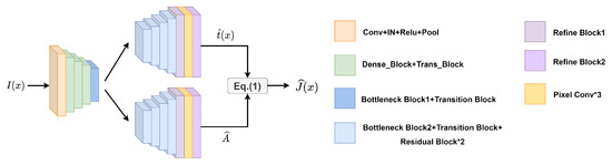 The specific network structure of the generator is shown in Figure 2. The left encoder is constructed based on the dense convolutional network (DCN) [15], using the Dense_Block and the Trans_Block in as the main modules. These modules are utilized to extract important features from the image. The right decoder estimates the scene information based on the features extracted from the encoder and restores the image to its original size. The structure of the decoder is similar to that of the encoder, including the bottleneck layer (Bottleneck Block) [13], the transmission layer (Transition Block), the residual layer (Residual Block), and the refinement layer (Refine Block) [8].