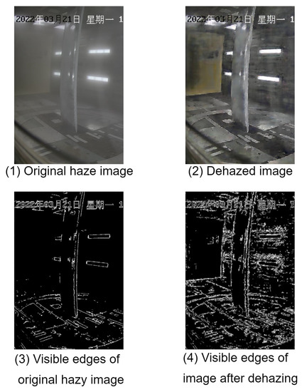 In the experiment, as we do not have corresponding reference clear images, in order to objectively demonstrate the dehazing effect, we used the widely used visible edge gradient method and NIQE to evaluate the experimental results. The visible edge gradient method has two important indicators: the ratio of visible edges e and the regularized mean visible edge gradient . Visible edges are assumed to be those with local contrast greater than 5%. As shown in Figure 5, after defogging, the overall contrast of the image is enhanced and the number of visible edges measured increases.