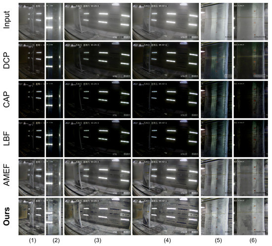 Comparison of six real foggy images in an icing wind tunnel with existing traditional methods. (1,2) LWC = 1.31; (3,4) LWC = 1.0; (5,6) LWC = 0.5.