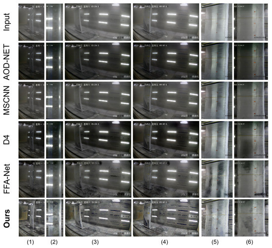 Comparison of six real foggy images in an icing wind tunnel with existing deep learning methods. (1,2) LWC = 1.31; (3,4) LWC = 1.0; (5,6) LWC = 0.5.