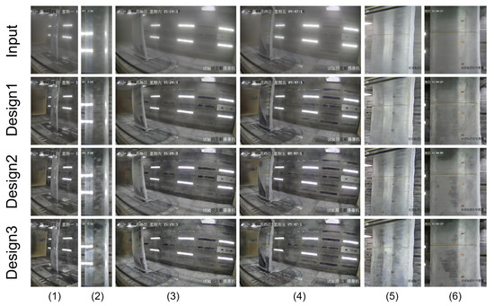 Comparison chart of ablation experiment effect. Design 1 means that only sub-pixel convolution is added, Design 2 means that only instance normalization is added, and Design 3 is our proposed model, which adds sub-pixel convolution and instance normalization. ((1–6) in the picture represent Image 1 to Image 6).