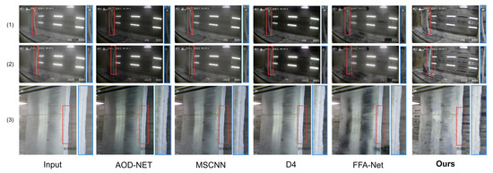To evaluate our proposed model more accurately, a comparison with state-of-the-art dehazing methods was performed on icing wind tunnel haze images. Advanced methods include traditional dehazing methods: DCP [2], CAP [3], AMEDF [24], LBF [25]; and deep learning methods: AOD-NET [26], MSCNN [6], FFA-Net [11], D4 [27].
