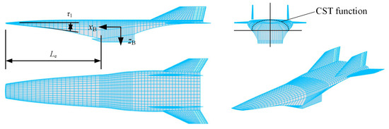 In this paper, the parametric keel-line is firstly formulated based on the second-order curve method, and then the section along with the body x-axis x is identified using the “shape function/class function” transformation (CST) technique [19]. To this end, the geometrical configuration of the aerospace vehicle is divided into two classes: the fuselage and wing. In particular, the fuselage shape is considered to be the stretching results of the profile curve for the body axis , and thus the fuselage design needs to first determine the relevant equation of each profile curve.