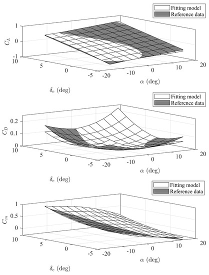 The structure of the SM regarding the aerodynamic and thrust coefficients is identified as the following fitting expressions: