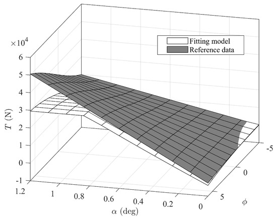 The goodness of fit VAF and mean square error RMSE of the polynomial model in Equation (20) are given in Table 1. In addition, the comparative results between the original model and the polynomial model at the flight condition of Ma 4 and 25.9 km are provided in Figure 2 and Figure 3.