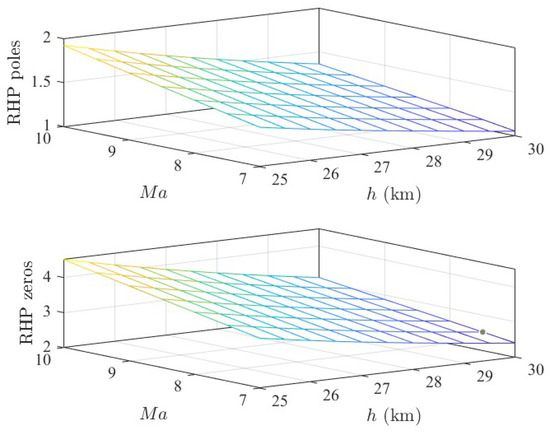The trim angle of attack, elevon deflection angle, and stoichiometric ratio increase with the increase in the flight height, whereas they will decrease with the increase in the flight velocity. In addition, the poles and zeros of the right half plane are plotted in Figure 5.