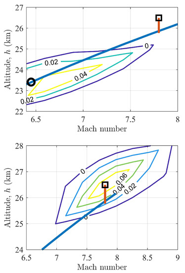 The value of NCSM and the gap metric are expressed in dB. The tendency of the gap metric shows a significant relation with dynamic pressure. Furthermore, it decreases as the velocity deviates from the design point, revealing the variation in open-loop dynamics with flight conditions. As for closed-loop dynamics, the nominal controller at the initial point is used for all cases in the flight envelope. Hence, the NSCM reveals the robustness of the closed-loop system if we keep the controller the same. The nominal value of NSCM for the start point is approximately 0.1. It dramatically decreases as the flight altitude increases by 2 km, whereas it remains as velocity increases. Moreover, simulation results show the same tendencies for the terminal points compared with the initial point. The evaluated gap margins for these two cases are provided in Figure 9. The circle in these figures represents the initial flight condition of ascent, whereas the square is the terminal point. Besides, the blue line denotes the constant dynamic pressure profile, and the orange line denotes the constant Mach number provile.