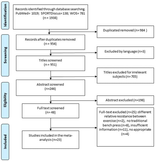The PICOS strategy was applied following the items: (a) Population: Subjects with some experience in bench press exercise; (b) Intervention or exposure: Bench press exercises; (c) Comparison: Another push pattern exercises; (d) Outcome: EMG activity of pectoralis major; (e) Study design: design experimental, cross-sectional studies, case studies, observational studies, or randomized clinical control (RCT). Thus, it was possible to establish the following inclusion criteria in a complementary way: (a) studies comparing the EMG activity of pectoralis major muscle of BP and OP; (b) EMG was recorded during the same motion and the same phase of contraction (e.g., concentric phase), so the only difference is the mode of exercise; (c) provide data concerning activation and deviations; (d) written in English, Spanish or Portuguese and published prior to March 2023; and (e) was published in a peer-reviewed journal.
