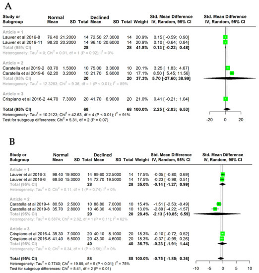 (A) Forest plot for muscle activation in Angle of declination in clavicular pectoralis (B) Forest plot for muscle activation in Angle of declination in sternal pectoralis.