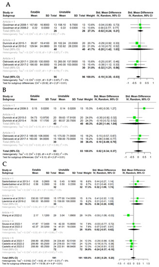 (A) Forest plot for muscle activation in Stability condition in concentric phase. (B) Forest plot for Stability condition in eccentric phase. (C) Forest plot for muscle activation in Stability condition of complete exercise.