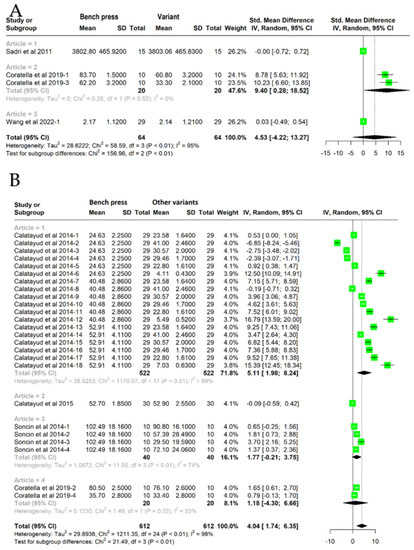 (A) Forest plot for muscle activation in bench press vs. push up. (B) Forest plot for muscle activation in Bench Press vs. other exercise no push up.