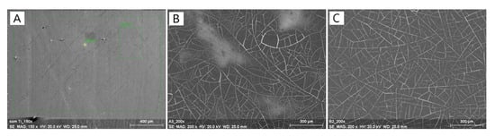 Scanning electron microscopy images depicted the morphology of the tannic acid-modified surfaces of the (A) control titanium plate without a layer of tannic acid, with lines showing the lines left during polishing; the 150× (B) titanium plate with embedded 5% tannic acid; and the (C) titanium plate with 10% tannic acid embedded (200×).