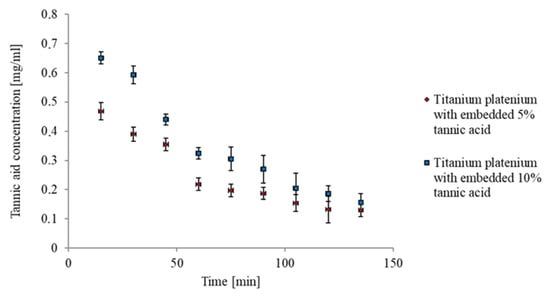 The time dependence of the tannic acid release is shown in Figure 2, where the concentration of tannic acid released from the material depended on the concentration of TA deposited on the surface of titanium plates. The released concentration of tannic acid, both in the case of the 5% and 10% concentration of tannic acid, decreased over time. This allows us to conclude the occurrence of the so-called burst effect.
