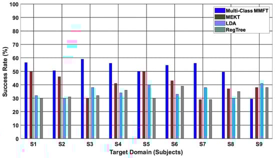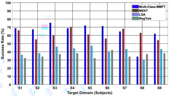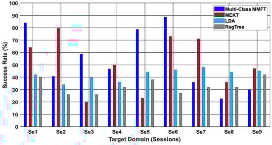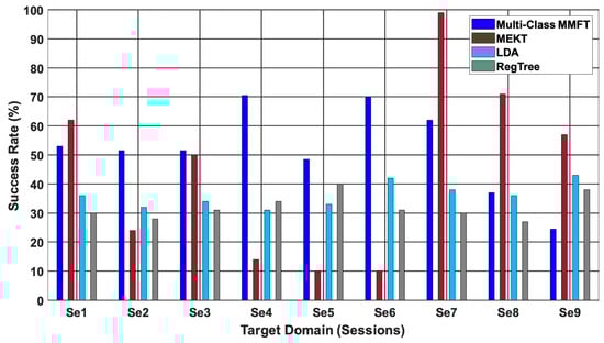 Figure 5 shows the comparison results between the proposed method, MEKT, and ML algorithms (LDA and RegTree) [34]. From the comparison, one finds that both transfer learning algorithms achieved the best performance across individual target domains. Multi-class MMFT, in this instance, achieved the highest CA of 88.7% when Se6 is a TD and (Se1~Se5 and Se7~Se9) are SDs, while MEKT recorded a highest CA of 80% when Se3 is a TD and (Se1~Se2 and Se4~Se9) are SDs. Moreover, utilizing samples from sessions acquired on different days to train and test the classifiers demonstrated to be an obstacle for ML algorithms, mainly due to the challenge of overfitting, which in turn deteriorated the classification performance. Hence, an inferior CA of 48%, which is the best performance by LDA, is observed when Se7 is used to test and (Se1~Se6 and Se8~Se9) are used to train the classifier, while a highest CA of 42% was recorded when (Se1~Se8) are used to train, and Se9 is used to test RegTree [17,34,35].