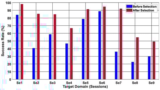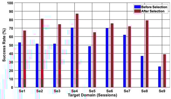 Moreover, a combination of NT and the complexity of a four-class problem proved to negatively affect the performance of multi-class MMFT across individual target domains [49,50], as depicted in Figure 9 and Figure 11. However, employing enhanced multi-class MMFT was demonstrated to effectively improve performance across individual target domains for both four-class cross-session and cross-subject classification. Notably, a CA of 37% was noted before source selection, while 79% was recorded after source selection when enhanced multi-class MMFT is employed for a four-class problem. A 42% increase in CA was observed after sources selection when Se8 is the TD and (Se4 and Se6) are optimally selected as the best combination.