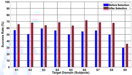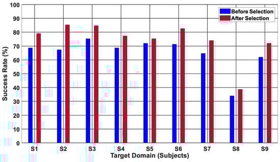 Table 4 shows the optimal selected closely related subjects (source domains) as each subject took a turn as the target domain. Notably, optimally selecting (S3 and S7) as SDs proved to yield a superior classification performance, with a CA of 71.5% recorded across S6 as a TD after source selection, while an inferior performance of 54.5% was observed before domain selection across S6 when all eight subjects are SDs as illustrated in Figure 12. Consequently, a 17% increase in accuracy was observed after optimally selecting only closely related source domains.