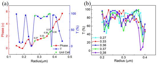 (a) The phase (red line) and transmittance curves (blue line) of outgoing light at 1.55 μm wavelength when the nanocolumn radius changes from 0.15 m to 0.45 μm. The radius dimension points of the selected metasurface unit cell structure are marked in green. (b) The transmittance curves corresponding to different distances of nanocolumns.